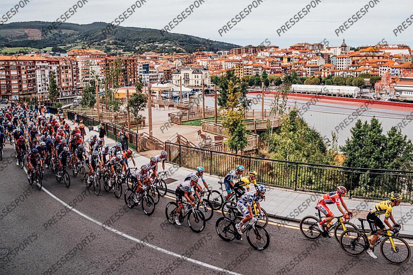 Picture by Zac Williams/SWpix.com - 03/09/2025 - Cycling - 2025 Vuelta Ciclista a Espana Stage 11, Bilbao to Bilbao, Spain - The peloton. La 11e étape de la Vuelta a été rabotée en raison des mouvements de protestation pro-palestiniens au niveau de la ligne d'arrivée. Pas d'arrivée, pas de vainqueur et les temps ont été gelés à trois kilomètres de l'arrivée. BILBAO/BILBAO