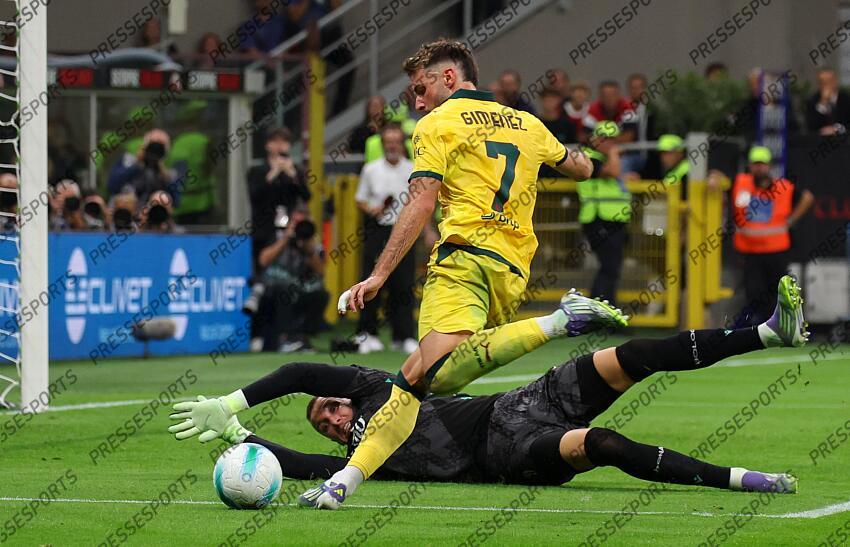 Foto IPP/Roberto Bregani Milano 14-09-2025 Calcio Campionato di Serie A 2025/2026, Milan-Bologna Nella foto Santiago Gimenez del Milan in azione contro Lukasz Skorupski del Bologna. Italy Photo Press World Copyright. MILAN AC-BOLOGNE (1-0)