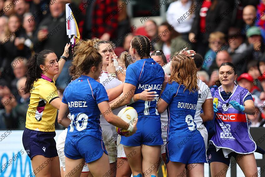 20 September 2025, Bristol - Women’s Rugby World Cup 2025, Semi-Finals - France v England Women - Teammates of Ellie Kildunne of England put their fingers on her lips as they push her away from the French players - Photo: Charlotte Wilson / Offside. FRANCE-ANGLETERRE (17-35)