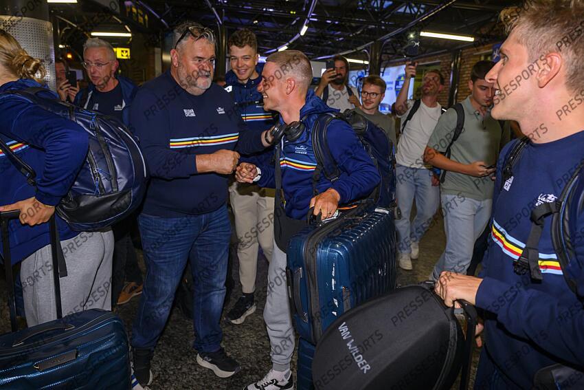 KIGALI, RWANDA - SEPTEMBER 18 : Evenepoel Remco (BEL) and other members of the Belgian delegation pictured during the arrival at Kigali Airport prior to the 92nd edition UCI Road World Championships on September 18, 2025 in Kigali, Rwanda, 18/09/2025 ( Photo by Jan De Meuleneir / Photonews AMBIANCE KIGALI