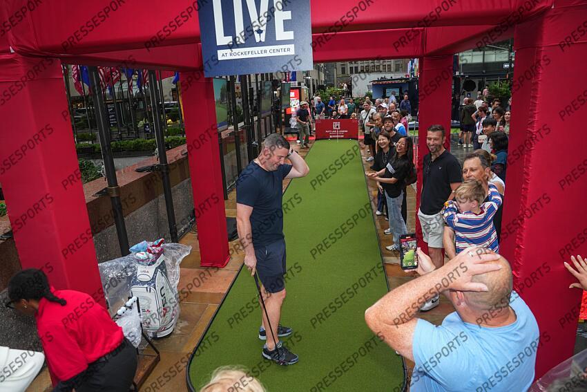 Sep 25, 2025; New York, New York, USA; A golfer reacts after nearly sinking a putt of 50 feet during a game at the Ryder Cup Live event at Rockefeller Center. Mandatory Credit: Lucas Boland-Imagn Images PGA: Ryder Cup Live