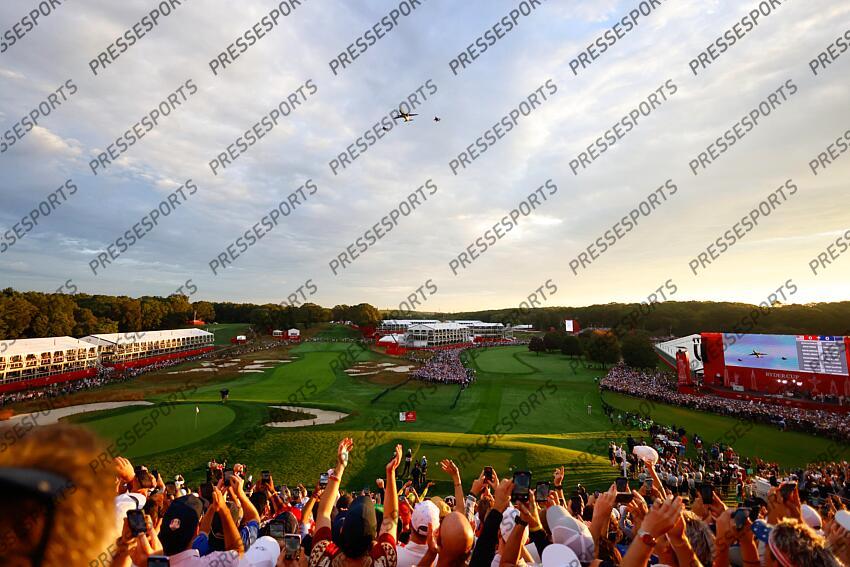 Sep 26, 2025; Bethpage, New York, USA; A plane escorted by fighter jets flys over the course as fans wait for the start of the first day of competition at the first tee for the Ryder Cup at Bethpage Black. Mandatory Credit: Peter Casey-Imagn Images morning-Foursomes depart Trou n1 PGA: Ryder Cup - First Day