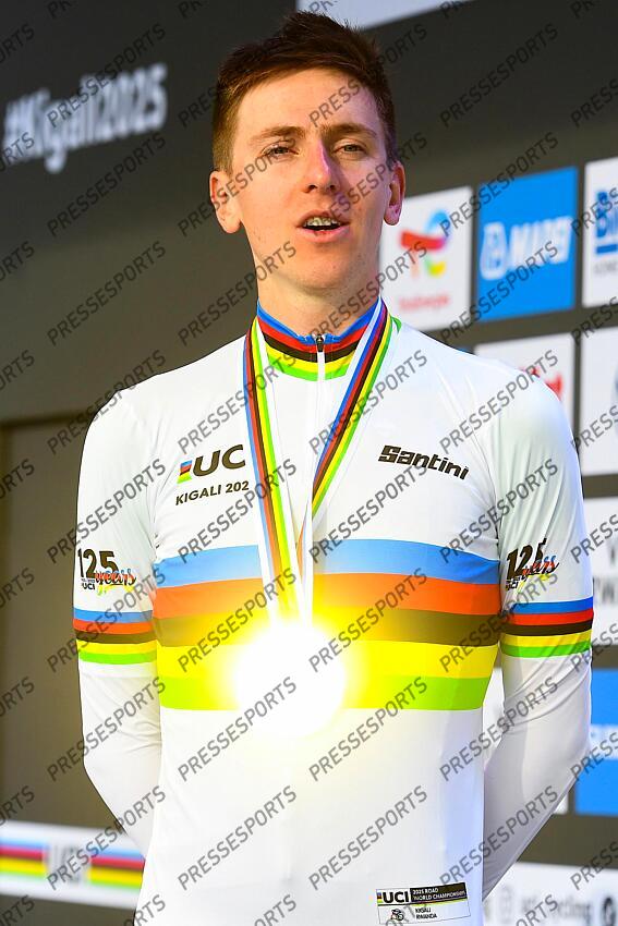 Picture by Simon Wilkinson/SWpix.com - 28/09/2025 - Cycling - 2025 UCI Road World Championships - Kigali Convention Centre, Kigali, Rwanda - Men Elite Road Race - Tadej Pogacar (Slovenia) receiving the Gold Medal to become World Champion with Remco Evenepoel (Belgium) receiving the Silver Medal and Ben Healy (Ireland) receiving the Bronze Medal ROUTE HOMMES