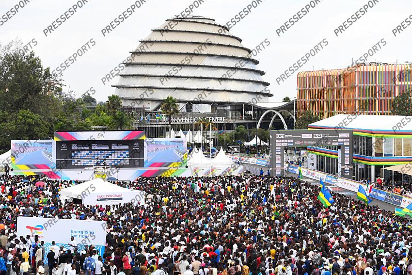 Picture by Simon Wilkinson/SWpix.com - 28/09/2025 - Cycling - 2025 UCI Road World Championships - Kigali Convention Centre, Kigali, Rwanda - Men Elite Road Race - Crowds at the finish area outside Kigali Convention Centre ROUTE HOMMES
