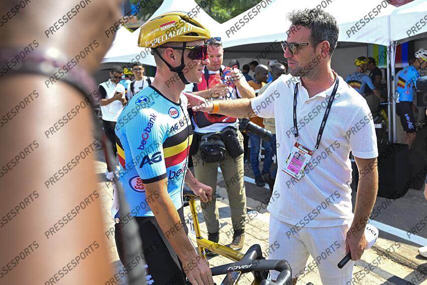 KIGALI, RWANDA - SEPTEMBER 28 : Evenepoel Remco (BEL) and Mark Cavendish during the Men Elite cycling road race of the UCI Road World Championships 2025 92nd edition an UCI World Championships cycling race of 267.5 km with start in Kigali and finish in Kigali on September 28, 2025 in Kigali, Rwanda, 28/09/2025 ( Photo by Jan De Meuleneir / Photonews ROUTE HOMMES