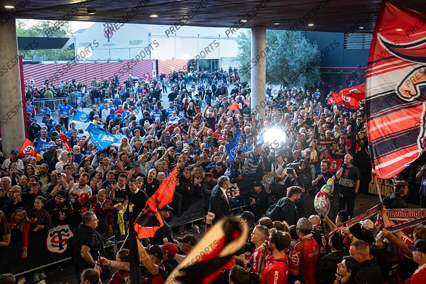 arrivee de joueurs, supporter, drapeau, LACROIX (Didier), president RUGBY TOP 14 2025 TOULOUSE-CASTRES (59-12) STAD ERNEST WALLON TOULOUSE FRANCE 27/09/2025 Fred Lancelot/PRESSE SPORTS