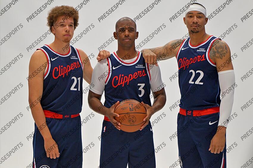 Sep 29, 2025; Inglewood, CA, USA; Los Angeles Clippers guard Jason Preston (21), guard Chris Paul (3) and forward Jordan Miller (22) pose during media day at Intuit Dome. Mandatory Credit: Jayne Kamin-Oncea-Imagn Images NBA: Los Angeles Clippers-Media Day