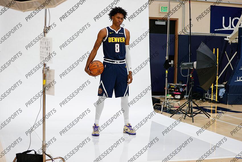 Sep 29, 2025; Denver, CO, USA; Denver Nuggets player Peyton Watson (8) poses for a picture during media day at Ball Arena. Mandatory Credit: Isaiah J. Downing-Imagn Images NBA: Denver Nuggets-Media Day