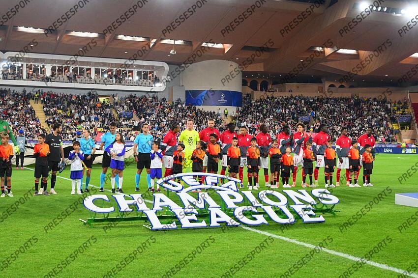 silva (bernardo) porras ayuso (guadalupe) gil manzano (jesus) nevado (angel) kehrer (thilo) kohn (philipp) dier (eric) teze (jordan) vanderson coulibaly (mamadou) diatta (krepin) akliouche (maghnes) salisu (mohammed) fati (ansu) balogun (folarin) FOOT LIGUE DES CHAMPIONS 2025 MONACO-MANCHESTER CITY (2-2) STADE LOUIS II MONACO FRANCE 01/10/2025 MOUNIC ALAIN trio d'arbitres espagnols logo UEFA Champions League