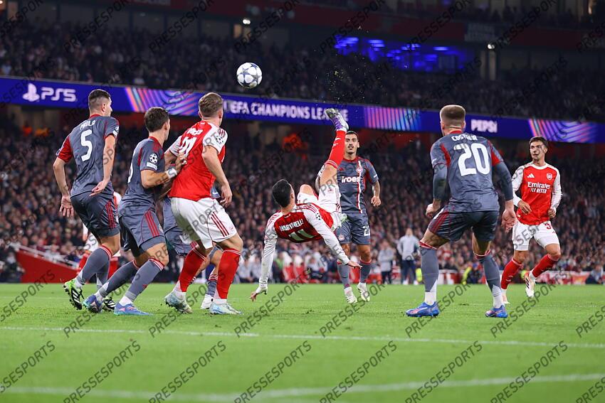 01 October 2025, London - UEFA Champions League - Arsenal v Olympiacos - Gabriel Martinelli of Arsenal makes an overhead kick - Photo: Jacques Feeney / Offside. ARSENAL-OLYMPIACOS (2-0)