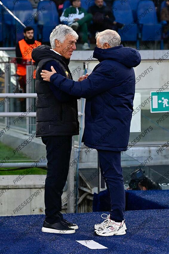Foto IPP/Cavaliere Emiliano. Roma 02/10/2025. Calcio Europa League 2025/2026. AS Roma - Lille. Nella foto: il saluto tra Gian Piero Gasperini e Bruno Genesio. Italy Photo Press - World Copyright AS ROME-LILLE (0-1)