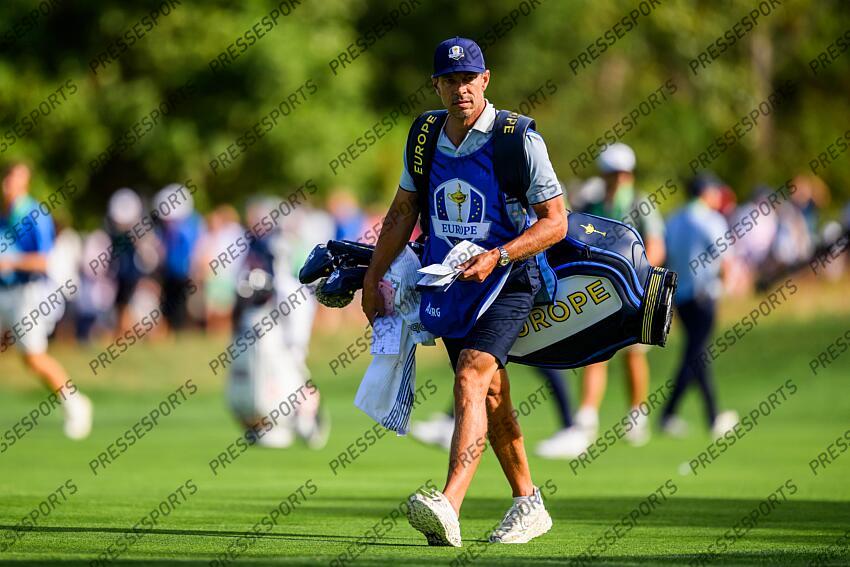 250926 Caddie Joe Skovron during a foursome match on day 1 of the Ryder Cup on September 26, 2025 in New York. Photo: Jesper Zerman / BILDBYRÅN / kod JZ / JZ0617 golf ryder cup day 1 bbeng 250926 Caddie Joe Skovron during a foursome match on day 1 of the Ryder Cup... FIRST DAY FOURSOMES