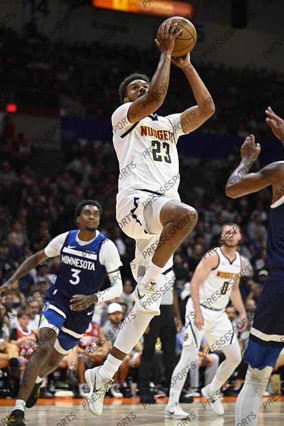 Oct 4, 2025; San Diego, California, USA; Denver Nuggets forward Cameron Johnson (23) shoots over Minnesota Timberwolves guard Rob Dillingham (4) during the first half at Pechanga Arena. Mandatory Credit: Denis Poroy-Imagn Images NBA: Preseason-Minnesota Timberwolves at Denver Nuggets