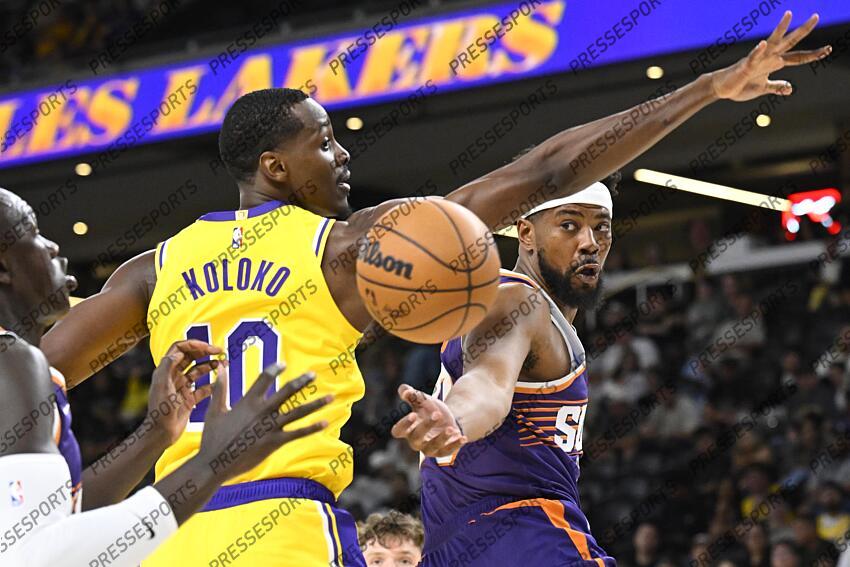 Oct 3, 2025; Palm Desert, California, USA; Phoenix Suns guard Jordan Goodwin (23) passes under Los Angeles Lakers center Christian Koloko (10) during the second half at Acrisure Arena. Mandatory Credit: Denis Poroy-Imagn Images NBA: Preseason-Phoenix Suns at Los Angeles Lakers