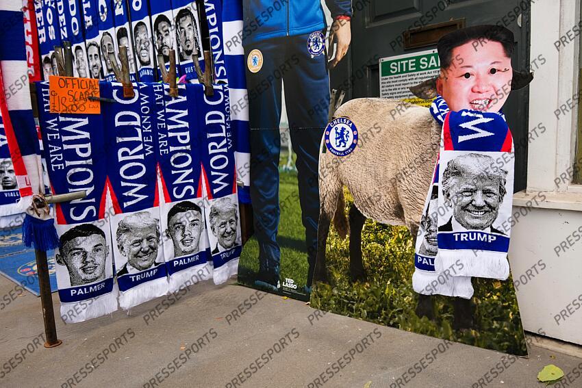 04 October 2025, London - Premier League Football - Chelsea v Liverpool - A Donald Trump Chelsea scarf is put onto the cardboard cutout of a sheep with a mask of Kim Jong Un on - Photo: Jacques Feeney / Offside. CHELSEA-LIVERPOOL FC (2-1)