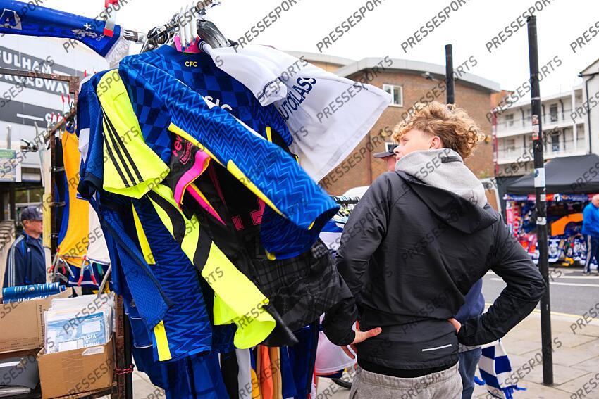 04 October 2025, London - Premier League Football - Chelsea v Liverpool - A gust of wind blows a rack of t shirts into the face of an onlooker - Photo: Jacques Feeney / Offside. CHELSEA-LIVERPOOL FC (2-1)