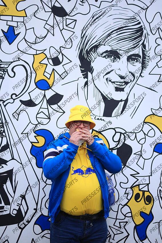 4th October 2025 - Premier League - Leeds United v Tottenham Hotspur - A Leeds United fan stands in front of a mural - Photo: Simon Stacpoole / Offside. Football - Premier League - Leeds United v Tottenham Hotspur