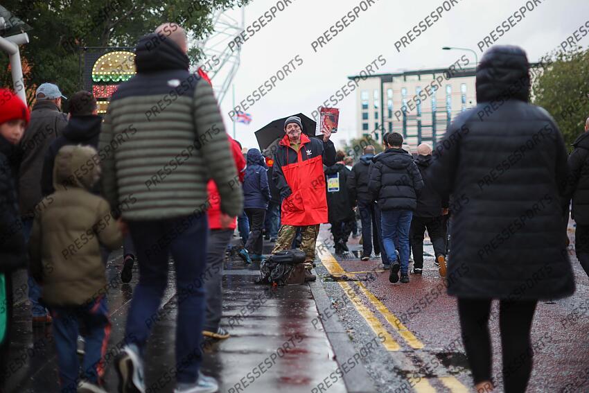 04 October 2025, Manchester - Premier League Football - Manchester United v Sunderland. A man sells the United We Stand fanzine in the rain before the match (photo by Daniel Chesterton) MANCHESTER UNITED-SUNDERLAND (2-0)