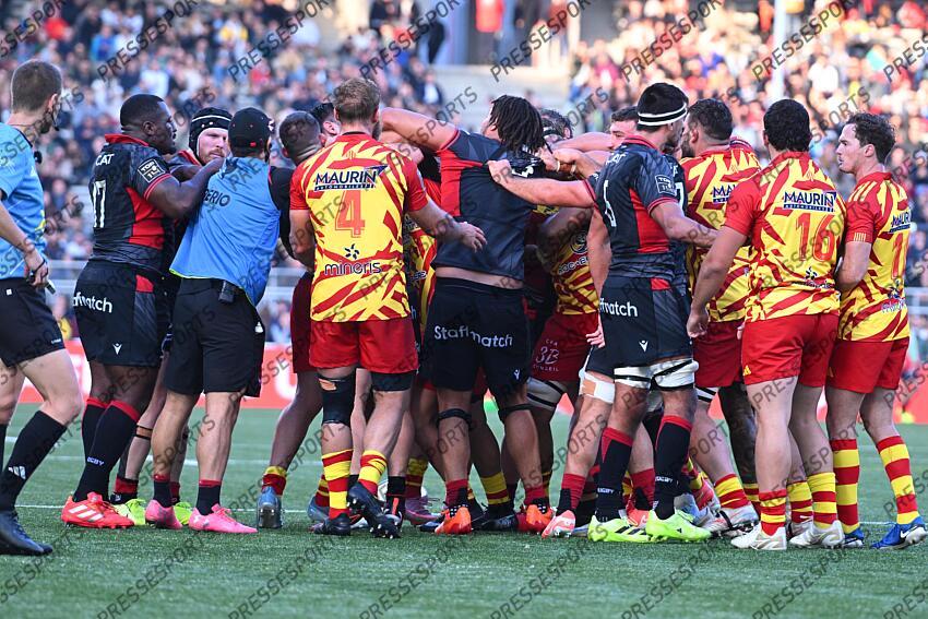 Fight between players during the Top14 match between Lyon and Perpignan at MATMUT Stadium on October 11, 2025 in Lyon, France. RUGBY TOP 14 2025 LYON OU-PERPIGNAN (44-19) MATMUT GERLAND STADIUM LYON FRANCE 11/10/2025 Mourad Allili/PRESSE SPORTS