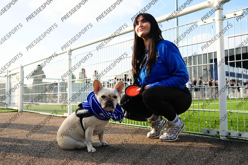 11 October 2025, London - FA Cup - Fourth Round Qualifying - Aveley v Gateshead - A dog in an Aveley scarf - Photo: Jacques Feeney / Offside. AVELEY-GATESHEAD (0-3)