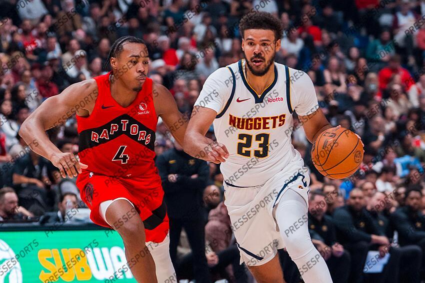 Oct 6, 2025; Vancouver, British Columbia, CAN; Denver Nuggets forward Cameron Johnson (23) drives past Toronto Raptors guard Scottie Barnes (4) in the second half at Rogers Arena. Mandatory Credit: Bob Frid-Imagn Images NBA: Preseason-Denver Nuggets at Toronto Raptors