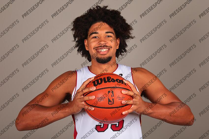 Sep 29, 2025; Miami, FL, USA; Miami Heat guard Ethan Thompson (55) poses for a photo during media day at Kaseya Center. Mandatory Credit: Sam Navarro-Imagn Images NBA: Miami Heat-Media Day