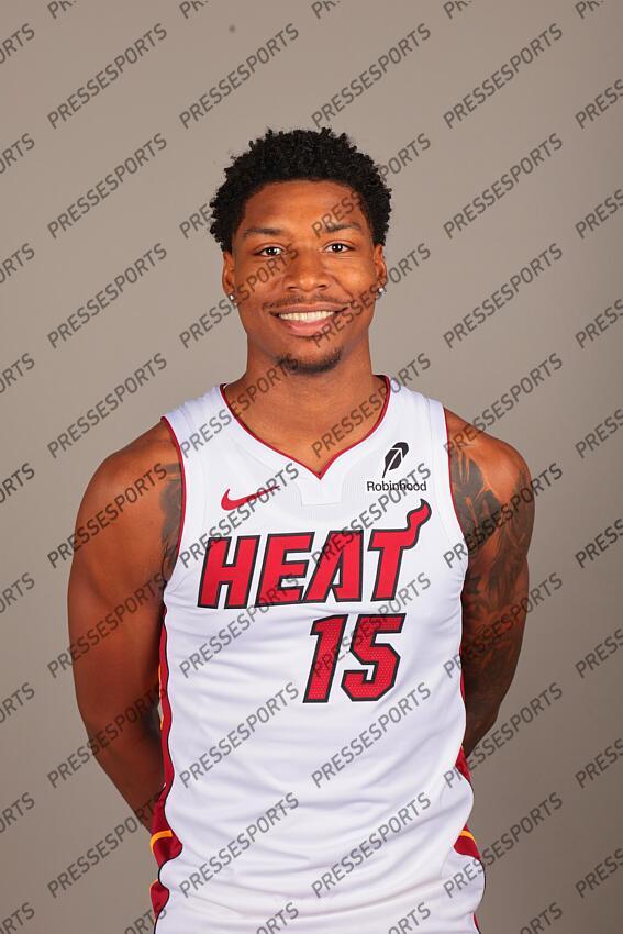 Sep 29, 2025; Miami, FL, USA; Miami Heat forward Myron Gardner (15) poses for a photo during media day at Kaseya Center. Mandatory Credit: Sam Navarro-Imagn Images NBA: Miami Heat-Media Day