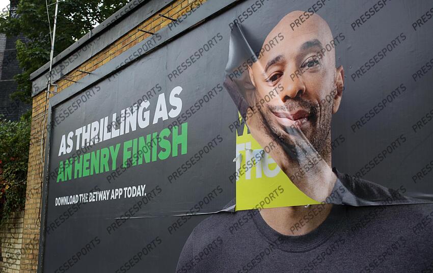 26 October 2025 London - Premier League Football - Arsenal v Crystal Palace - the face of Thierry Henry adorns a damaged betting billboard - (Photo by Mark Leech). publicite site de pari en ligne jeu d'argent paris sportifs ARSENAL-CRYSTAL PALACE (1-0)