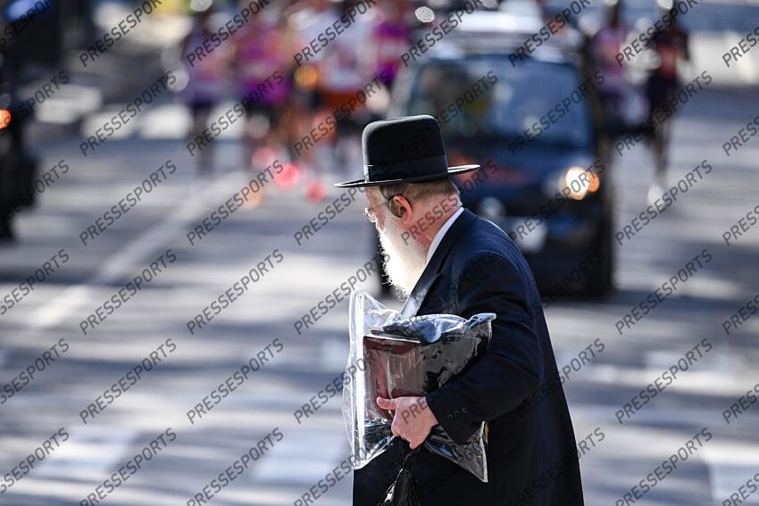 Nov 2, 2025; New York, NY, USA; A pedestrian crosses the street in Brooklyn as mens pro division runners approach during the 2025 TCS New York City Marathon. Mandatory Credit: John Jones-Imagn Images Running: New York City Marathon