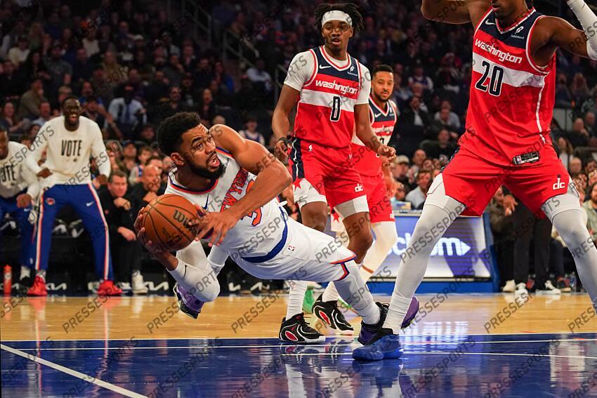 Nov 3, 2025; New York, New York, USA; New York Knicks center Karl-Anthony Towns (32) goes to the floor during a pass attempt after an offensive rebound over Washington center Alex Sarr (20) during the first half at Madison Square Garden. Mandatory Credit: Lucas Boland-Imagn Images NBA: Washington Wizards at New York Knicks