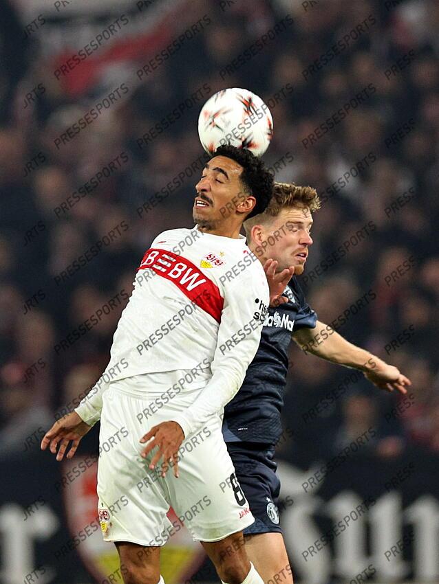 STUTTGART - (l-r) Tiago Tomas of VfB Stuttgart, Gijs Smal of Feyenoord during the UEFA Europa League match between VFB Stuttgart and Feyenoord Rotterdam at the Stuttgart Arena on November 6, 2025, in Stuttgart, Germany. ANP BART STOUTJESDIJK STUTTGART-FEYENOORD (2-0)