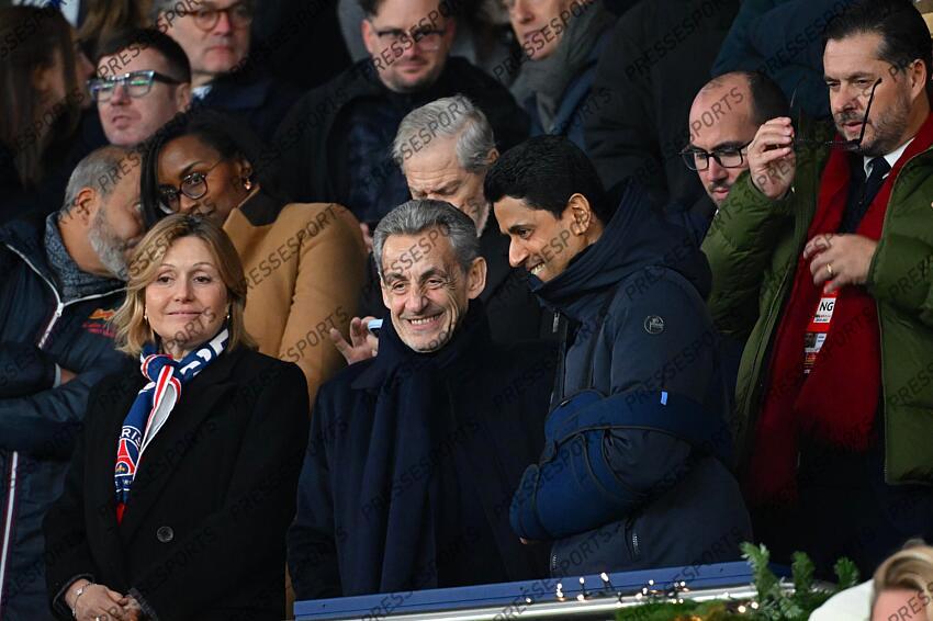 braun pivet (yael) sarkozy (nicolas) al khelaifi (nasser) FOOT LIGUE DES CHAMPIONS 2025 PSG-TOTTENHAM (5-3) PARC DES PRINCES PARIS FRANCE 26/11/2025 REAU ALEXIS