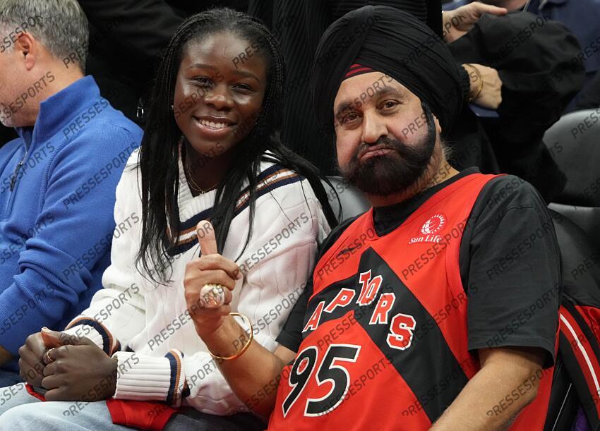 Nov 24, 2025; Toronto, Ontario, CAN; Canadian tennis star Victoria Mboko (left) sits court side with Toronto Raptors superfan Nav Bhatia (right) during a game between the Cleveland Cavaliers and Toronto Raptors during the second half at Scotiabank Arena. Mandatory Credit: John E. Sokolowski-Imagn Images NBA: Cleveland Cavaliers at Toronto Raptors