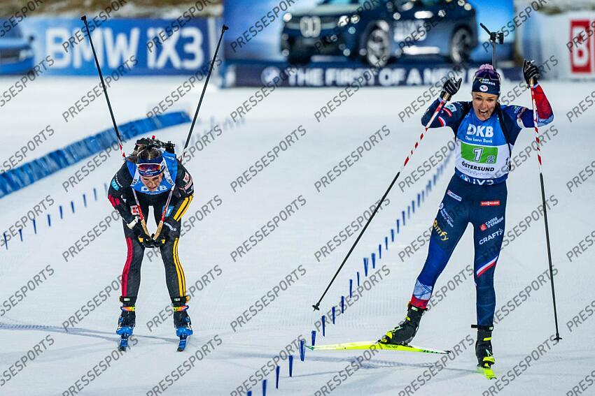 OESTERSUND, SWE - NOVEMBER 30: Camille Bened of Team France takes 3rd place, Fichtner Marlene takes 4th place during BMW IBU Biathlon World Cup Single Mixed Relay on November 30, 2025 in Oestersund, Sweden. (Photo by Kevin Voigt/Agence Zoom) RELAIS MIXTE SIMPLE