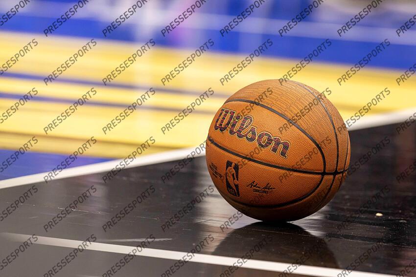 Nov 28, 2025; Detroit, Michigan, USA; The Wilson game ball sits on the floor on a play stoppage during the first quarter between the Detroit Pistons and the Orlando Magic at Little Caesars Arena. Mandatory Credit: David Reginek-Imagn Images NBA: Orlando Magic at Detroit Pistons