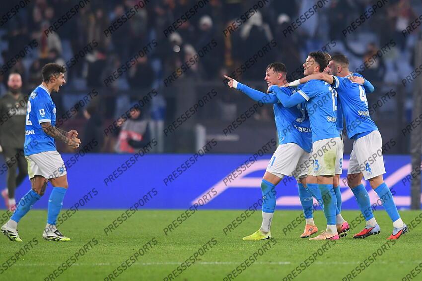Foto IPP/Luciano Adriani Roma 30/11/2025 Campionato di Calcio Serie A 2025/2026 Roma vs Napoli Nella foto: esultanza napoli a fine gara, al fischio dell? arbitro, con Giovanni Di Lorenzo a sinistra che va verso i compagni Italy Photo Press - World Copyright NAPLES-AS ROME (1-0)