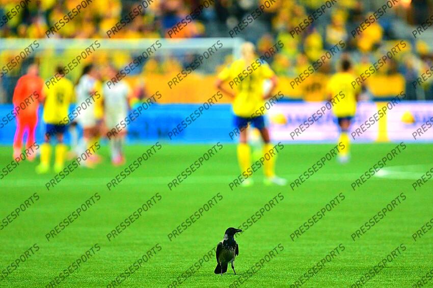 A crow on the pitch during the UEFA Nations League game on December 2nd 2025 between Sweden and France at Stockholm Arena in Stockholm, Sweden PUBLICATIONxNOTxINxBRAxMEX Copyright: xPeterxSonander/SPPx Sportspressphoto_SPR69058 petitie finale match pour la 3e place SUEDE FEM-FRANCE FEM (2-2)