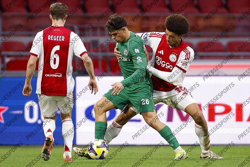 AMSTERDAM - (l-r) Youri Regeer of Ajax, Thom van Bergen of FC Groningen, Aaron Bouwman of Ajax during the Dutch Eredivisie match between AFC Ajax and FC Groningen at the Johan Cruijff ArenA on December 2, 2025, in Amsterdam, Netherlands. ANP | Hollandse Hoogte | MAURICE VAN STEEN AJAX AMSTERDAM-FC GRONINGUE (2-0)