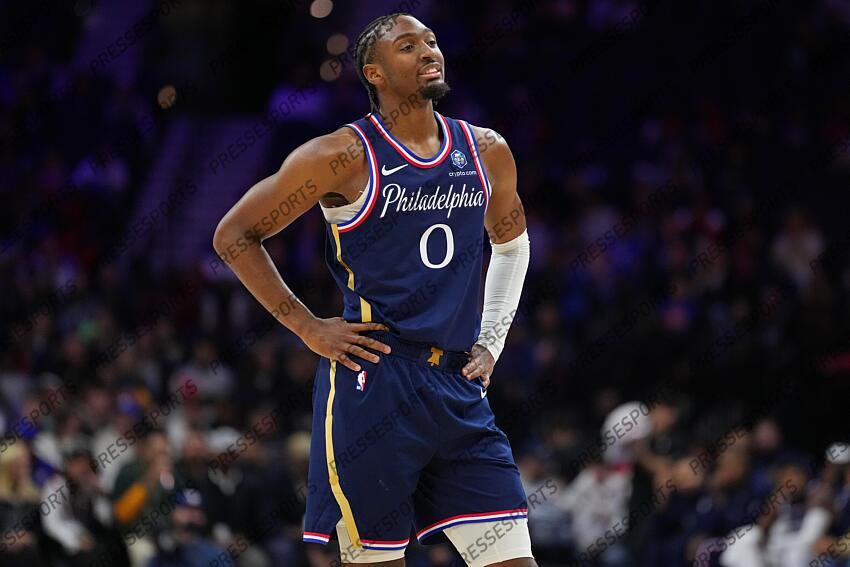 Dec 2, 2025; Philadelphia, Pennsylvania, USA; Philadelphia 76ers guard Tyrese Maxey (0) loos on against the Washington Wizards in the first quarter at Xfinity Mobile Arena. Mandatory Credit: Kyle Ross-Imagn Images NBA: Washington Wizards at Philadelphia 76ers
