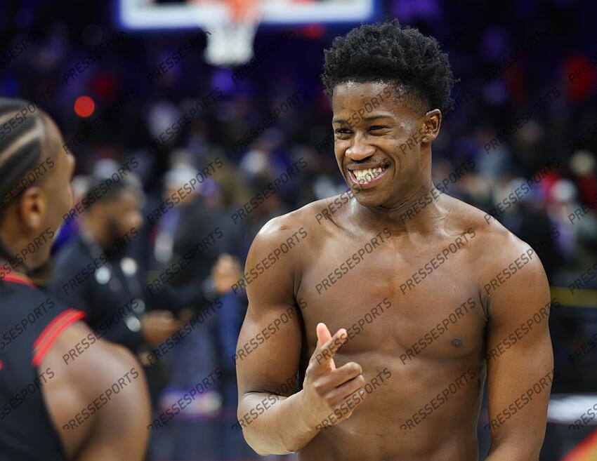 Dec 4, 2025; Philadelphia, Pennsylvania, USA; Philadelphia 76ers guard VJ Edgecombe reacts after a victory against the Golden State Warriors at Xfinity Mobile Arena. Mandatory Credit: Bill Streicher-Imagn Images NBA: Golden State Warriors at Philadelphia 76ers