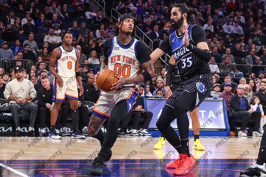Dec 7, 2025; New York, New York, USA; New York Knicks guard Jordan Clarkson (00) drives past Orlando Magic center Goga Bitadze (35) in the first quarter at Madison Square Garden. Mandatory Credit: Wendell Cruz-Imagn Images NBA: Orlando Magic at New York Knicks