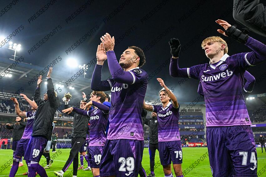 players of Anderlecht with Mario Stroeykens (29) of Anderlecht and Nathan De Cat (74) of Anderlecht celebrate after winning during the Jupiler Pro League season 2025 - 2026 matchday 16 game between RSC Anderlecht and Royale Union Saint-Gilloise on November 30 , 2025 in Anderlecht, Belgium. (Photo by David Catry / Isosport) ANDERLECHT-UNION SAINT-GILLOISE (1-0)
