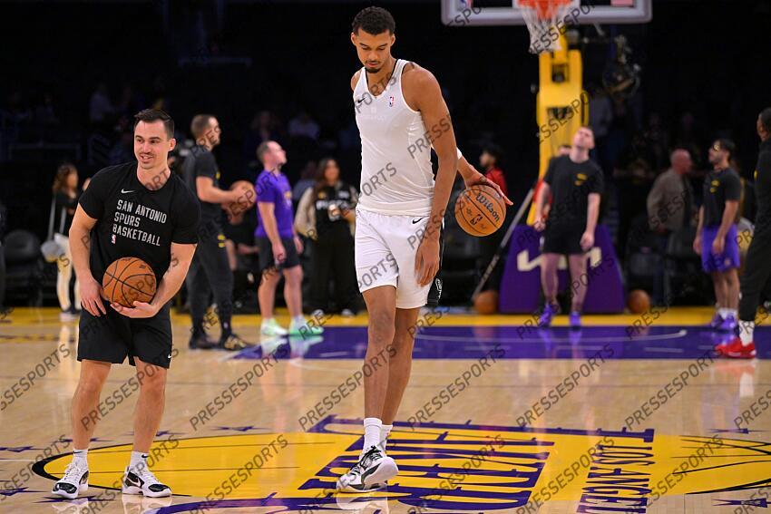 Dec 10, 2025; Los Angeles, California, USA; San Antonio Spurs forward Victor Wembanyama (1) warms up prior to the game against the Los Angeles Lakers at Crypto.com Arena. Mandatory Credit: Jayne Kamin-Oncea-Imagn Images NBA: San Antonio Spurs at Los Angeles Lakers