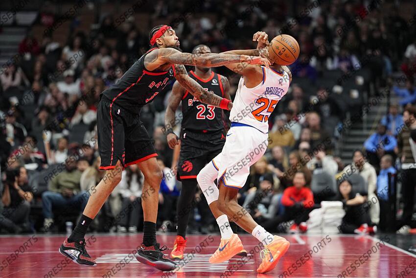 Dec 9, 2025; Toronto, Ontario, CAN; Toronto Raptors forward Brandon Ingram (3) battles for the ball against New York Knicks guard Mikal Bridges (25) during the second half at the 2025-26 NBA Emirates Cup at Scotiabank Arena. Mandatory Credit: Kevin Sousa-Imagn Images NBA: New York Knicks at Toronto Raptors