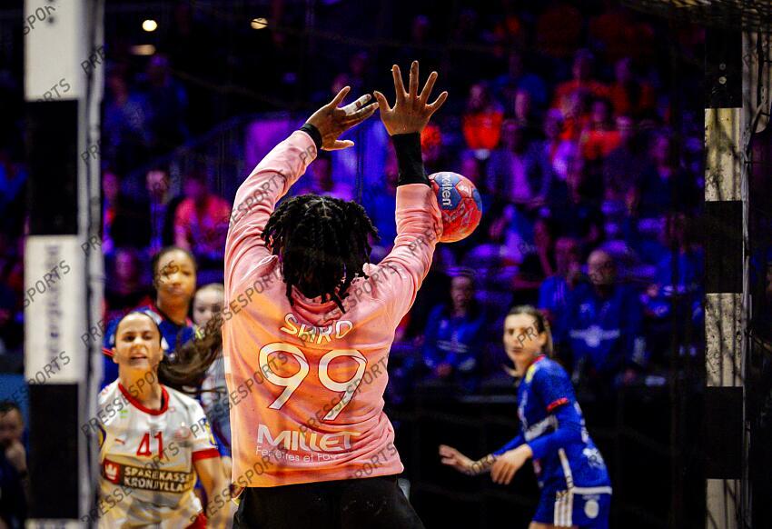 ROTTERDAM - Hatadou Sako (FRA) saves a ball during the World Handball Championship quarterfinal between Denmark and France in Ahoy Rotterdam. ANP ROBIN VAN LONKHUIJSEN DANEMARK-FRANCE (26-31)