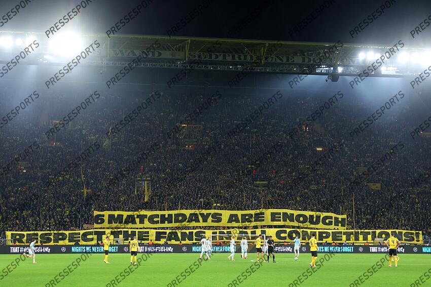 DORTMUND - Dortmund fans hold a banner during the Champions League match between Borussia Dortmund and FK Bodo/Glimt at Signal Iduna Park on December 10, 2025, in Dortmund, Germany. ANP | Hollandse Hoogte | Bart Stoutjesdijk BORUSSIA DORTMUND-FK BODO/GLIMT (2-2)