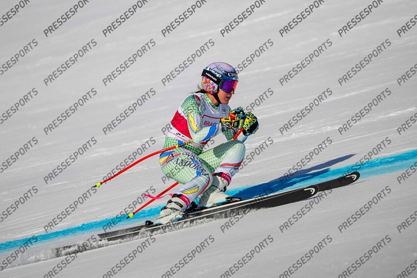 ST MORITZ, SWITZERLAND - DECEMBER 12: Cande Moreno of Team Andorra during the Audi FIS Alpine Ski World Cup Women's Downhill on December 12, 2025 in St Moritz, Switzerland. (Photo by Mateo Sgambato/Agence Zoom) DESCENTE ST MORITZ