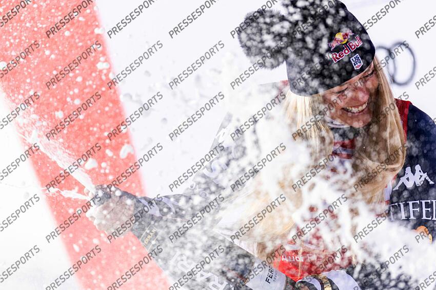 Foto IPP/Gabriele Facciotti | Pentaphoto Sankt St. Moritz 12/12/2025 Sci Alpino Coppa del Mondo 2025/2026 Discesa Libera Femminile nella foto Lindsey Vonn esulta festeggiando sul podio la vittoria DESCENTE ST MORITZ