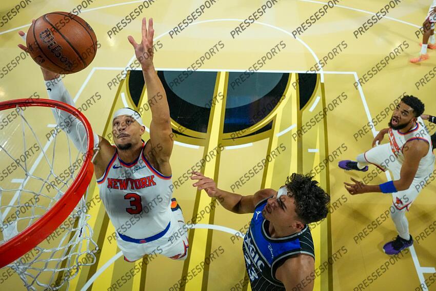 Dec 13, 2025; Las Vegas, Nevada, USA; New York Knicks guard Josh Hart (3) reaches of the rebound as Orlando Magic forward Tristan da Silva (23) looks on during a game at T-Mobile Arena. Mandatory Credit: Kirby Lee-Imagn Images NBA: Emirates Cup-Semi Finals-New York Knicks at Orlando Magic