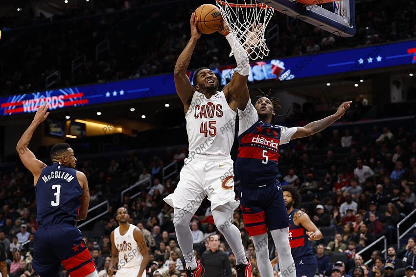 Dec 12, 2025; Washington, District of Columbia, USA; Cleveland Cavaliers guard Donovan Mitchell (45) shoots the ball as Washington Wizards guard Jamir Watkins (5) and Wizards guard CJ McCollum (3) defend in the fourth quarter at Capital One Arena. Mandatory Credit: Geoff Burke-Imagn Images NBA: Cleveland Cavaliers at Washington Wizards
